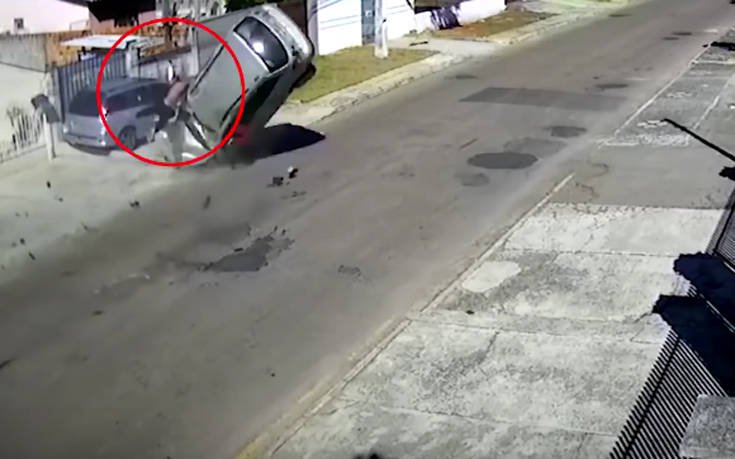 Το βίντεο καταγράφηκε από κάμερα κλειστού κυκλώματος, με το αμάξι να γίνεται τελικά σμπαράλια.