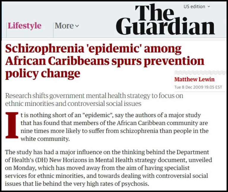 Σύμφωνα με αναφορά του Ινστιτούτου Ψυχιατρικής του Ηνωμένου Βασιλείου, οι άνθρωποι που είναι από «Αφρική-Καραϊβική» είναι «έξι φορές πιο πιθανό από ότι οι λευκοί να διαγνωσθούν ως σχιζοφρενείς». (Περιττό να πούμε ότι η έκθεση αυτή κατηγορήθηκε ότι φταίει ο «ρατσισμός των λευκών» για τα υψηλότερα ποσοστά σχιζοφρένειας των μαύρων).