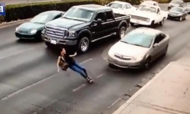 Αυτή είναι η τρομακτική στιγμή που η 22χρονη Minerva F.S. διασχίζει τρέχοντας τον δρόμο ενώ μιλάει στο κινητό της τηλέφωνο. Γλίστρησε στον δρόμο και την πάτησε αυτοκίνητο.
