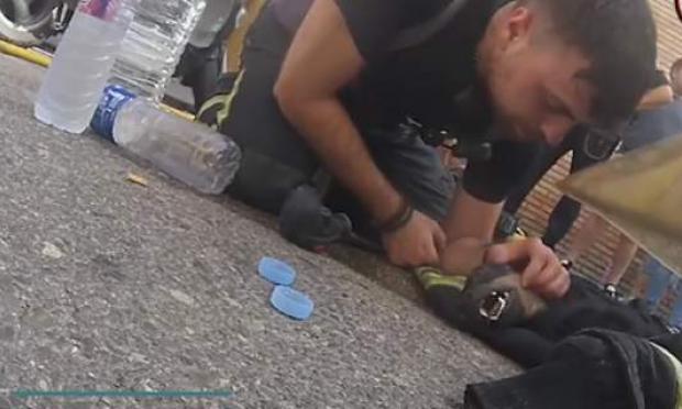 Οπως φαίνεται στην ενσωματωμένη κάμερα που είχε πάνω του ο πυροσβέστης, ο ίδιος έβγαλε το μικρό σκυλάκι από το κτίριο και αμέσως του έκανε καρδιοπνευμονική αναζωογόνηση και το έλουσε με νερό προκειμένου να το κρατήσει στην ζωή.