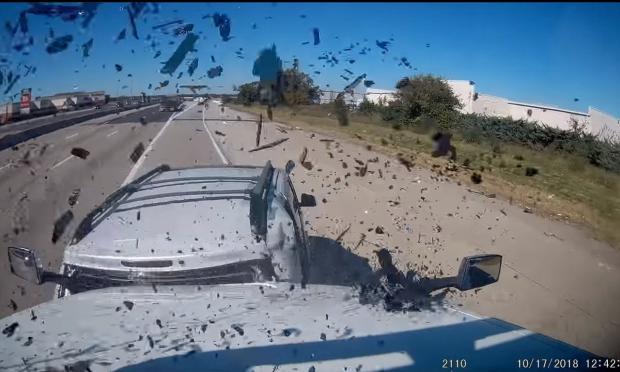 Ακολούθησε χάος, καθώς όλοι έκαναν ελιγμούς για να αποφύγουν το σταματημένο αυτοκίνητο. Με αποσπασμένη την προσοχή του, ο οδηγός της νταλίκας με την κάμερα στο ταμπλό δεν μπόρεσε να φρενάρει αρκετά κι έπεσε με δύναμη στο προπορευόμενο Toyota MPV, στέλνοντάς το για ράλι στα χώματα, ενώ από την άλλη μεριά, μια δεύτερη τεράστια νταλίκα ανατράπηκε προσπαθώντας να κάνει ελιγμό αποφυγής.