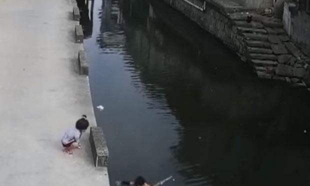 Εικόνες από κάμερα ασφαλείας δείχνουν δύο κορίτσια να παίζουν δίπλα στο ποταμό Shaoxing, στην Κίνα. Ένα από τα μικρά παιδιά πέφτει μέσα στο νερό και προσπαθεί να επιπλεύσει με δυσκολία.