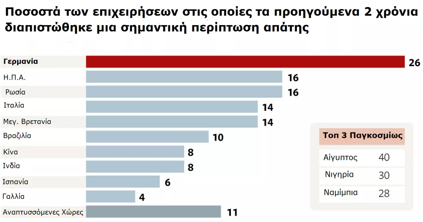 Ήδη από το 2014 η γερμανική εφημερίδα DIE WELT έγραφε πως σε θέματα διαφθοράς πιστεύουν πολλοί ότι, προηγούνται χώρες όπως η Κίνα, η Ελλάδα ή η Ρωσία (πηγή) – παραθέτοντας όμως ένα γράφημα, από το οποίο διαπιστώνεται πως η Γερμανία είναι στην 4η θέση παγκοσμίως, μετά την Αίγυπτο, τη Νιγηρία και τη Ναμίμπια (όλες οι άλλες αφρικανικές!), χωρίς να υπάρχει καθόλου η Ελλάδα στις πρώτες θέσεις. Με δεδομένες δε τις συνεχείς απάτες, καθώς επίσης τη διαφθορά που έχει αποκαλυφθεί όσον αφορά τη Deutsche Bank, ίσως να έχει κατακτήσει πια την πρώτη θέση – επιμένοντας παρόλα αυτά να κατηγορεί την Ελλάδα, προφανώς για να διευκολύνει τη ληστεία της.