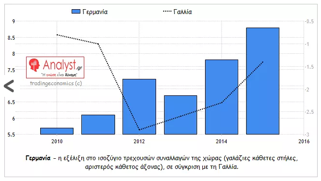 Κλείνοντας, αφού μία εικόνα είναι χίλιες λέξεις, όλοι γνωρίζουν πια πως η Γερμανία τρέφεται από την κρίση υπερχρέωσης της Ευρωζώνης – παράγοντας μετά το 2009 τεράστια πλεονάσματα στο ισοζύγιο της, με τη βοήθεια της ΕΚΤ και του ευρώ. Η σύγκριση της δε με τη Γαλλία, όπου οι μπλε στήλες και η αριστερή κάθετος στο γράφημα που ακολουθεί αφορούν τη Γερμανία, ενώ η διακεκομμένη καμπύλη (δεξιά κάθετος) τη Γαλλία, είναι τρομακτική – αρκεί βέβαια να προσέξει κανείς πως η δεξιά κάθετος παραμένει αρνητική, παρά το ότι ανέκαμψε από το -3% το 2012, στο περίπου -1,5% το 2016 (ενώ η αριστερή, η Γερμανία δηλαδή, έφτασε στο τεράστιο +8,5% του ΑΕΠ, ήτοι πάνω από 250 δις €).