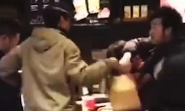 Στα βίντεο που δημοσιεύτηκαν εμφανίζεται και μια γυναίκα να κλωτσά έναν άνδρα στα πόδια, μπροστά σε άλλους, τρομοκρατημένους πελάτες.