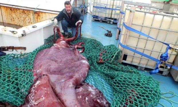 Σε αντίθεση με τον πιο πάνω κροκόδειλο, το τεράστιο καλαμάρι δεν έχει ποτέ αιχμαλωτιστεί ζωντανό. Αυτό το είδος καλαμαριού μπορεί να φτάσει μέχρι και τα 14 μέτρα σε μήκος και τον ένα τόνο σε βάρος, ενώ διαθέτει οκτώ χοντρά «άκρα», άλλα δύο πιο μακριά πλοκάμια και μάτια διαμέτρου 10 εκατοστών.
