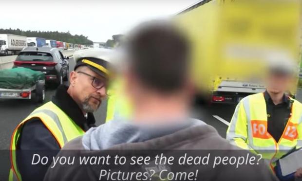 "Έλα, θα σου δείξω κάτι... θες να δεις τον νεκρό; να τραβήξεις φωτογραφίες; Εκεί είναι, κείτεται εκεί, θες να τον δεις; 'Οχι; δεν θέλεις να τον δεις; Τότε γιατί τραβούσες φωτογραφίες;" ρωτάει τον φανερά αμήχανο οδηγό από την Τσεχία πριν του επιβάλει πρόστιμο 128,5 ευρώ για την λήψη φωτογραφιών από το δυστύχημα