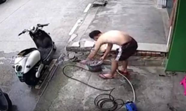 Όμως λόγω βλάβης στο μηχάνημα το ρεύμα χτυπάει τον άνδρα, που ξεκινά να τρέμει και πέφτει στο έδαφος. Μετά από συνολικά 20 δευτερόλεπτα ο 23χρονος καταφέρνει να βγάλει το πιεστικό από την πρίζα.