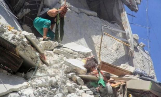 Στην συγκλονιστική εικόνα, ένα πεντάχρονο κορίτσι, εγκλωβισμένο στα χαλάσματα ενός βομβαρδισμένου κτιρίου, γραπώνει απεγνωσμένα την μόλις επτά μηνών αδελφούλα του από το μπλουζάκι της, προκειμένου να μην πέσει στο κενό, ενώ ο πατέρας των κοριτσιών τις κοιτάζει έντρομος και ανήμπορος.
