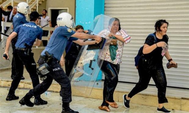 Στο Ντιγιάρμπακιρ, τη μεγαλύτερη πόλη της περιοχής, οι αστυνομικοί χρησιμοποίησαν κατ’ επανάληψη νερό υπό πίεση εναντίον μιας μικρής ομάδας διαδηλωτών οι οποίοι κουλουριάζονταν στον δρόμο για να προστατευθούν και έκαναν το σήμα της νίκης με τα δάχτυλά τους.