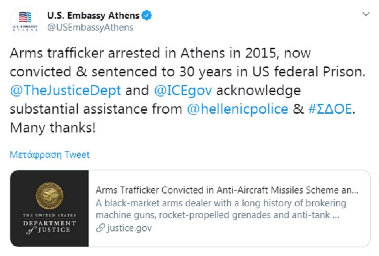 Καταδικάσθηκε σε 30 χρόνια φυλάκιση μετά από σημαντική η βοήθεια από την ΕΛ.ΑΣ και το ΣΔΟΕ αναφέρει η Αμερικάνικη πρεσβεία.