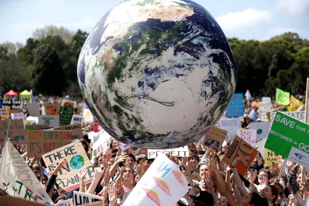 Μια πελώρια υδρόγειος πάνω από τους μαθητές που διαδηλώνουν για την κλιματική αλλαγή στην Αυστραλία
