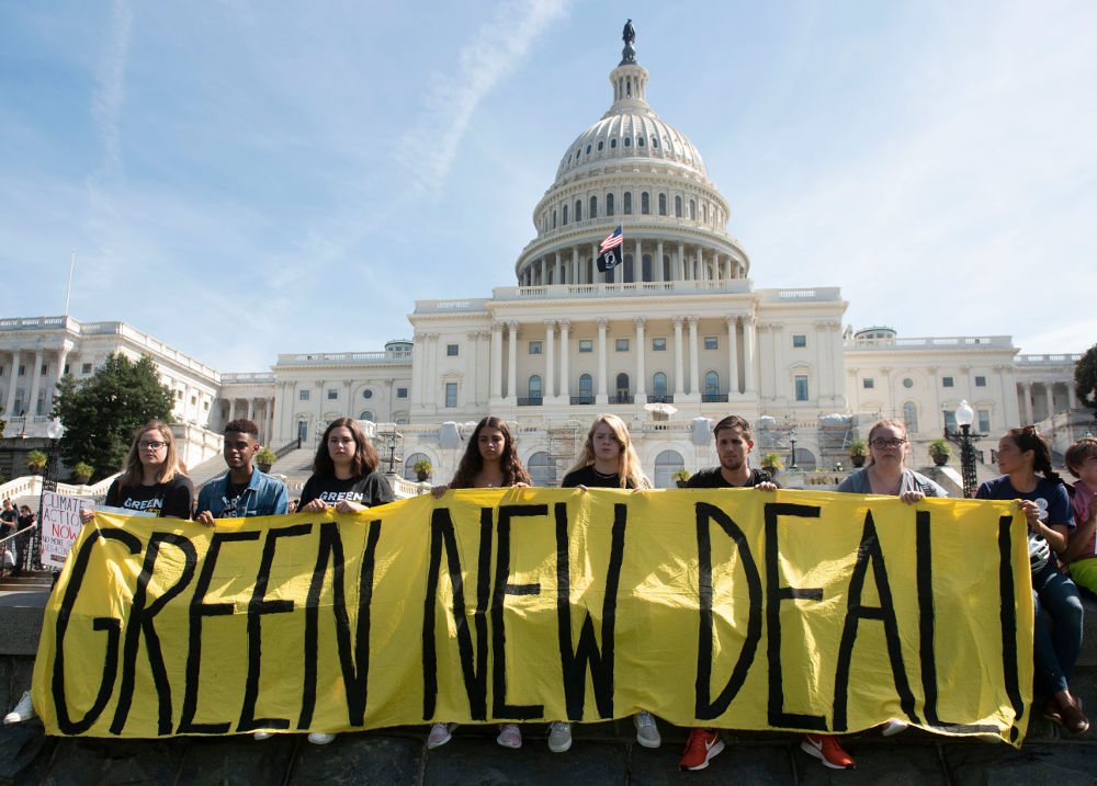 Νέοι υψώνουν πανό για μια νέα «πράσινη συμφωνία» μπροστά από το Καπιτώλιο στην Ουάσιγκτον των ΗΠΑ