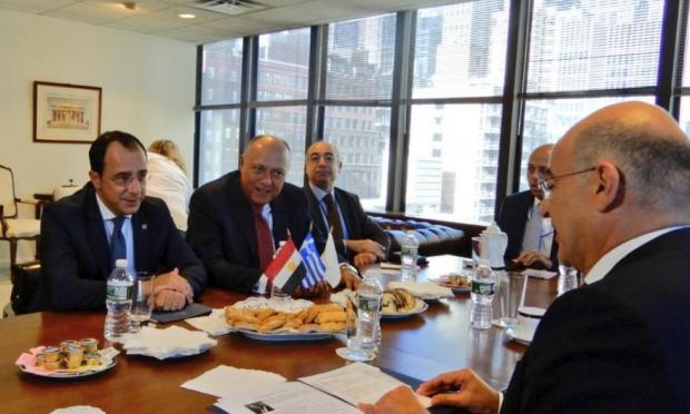 Οι Υπουργοί Εξωτερικών της Κύπρου, της Αιγύπτου και της Ελλάδας καταδίκασαν τις παράνομες ενέργειες της Τουρκίας στο Αιγαίο και την ανατολική Μεσόγειο με ιδιαίτερη έμφαση στις κλιμακούμενες και προκλητικές γεωτρήσεις της Τουρκίας, τις σεισμικές έρευνες και την στρατιωτική παρουσία στις κυπριακές θαλάσσιες ζώνες. Αυτό περιλαμβάνει κοινή δήλωση μετά την συνάντηση Χριστοδουλίδη, Σούκρι και Δένδια που πραγματοποιήθηκε στο περιθώριο της Γενικής Συνέλευσης των Ηνωμένων Εθνών.