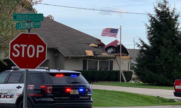 Ο Joe Nyre, στο Beloit του Wisconsin, καθόταν αργά το απόγευμα στο σπίτι του και παρακολουθούσε έναν αγώνα ποδοσφαίρου στην τηλεόραση όταν άκουσε έναν τρομακτικό θόρυβο και την επόμενη στιγμή είδε να κρέμεται πάνω από το κεφάλι του ένα αυτοκίνητο!