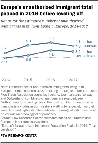 Το Pew Research Center διαπίστωσε ότι από τα 500 εκατομμύρια άτομα που ζουν στις 32 ευρωπαϊκές χώρες, από 3,9 έως 4,8 εκατομμύρια ήταν παράνομοι μετανάστες. Αυτό, σε σύγκριση με τα 3 έως 3,7 εκατομμύρια παράνομους μετανάστες που καταγράφηκαν το 2014 στην Ευρώπη.