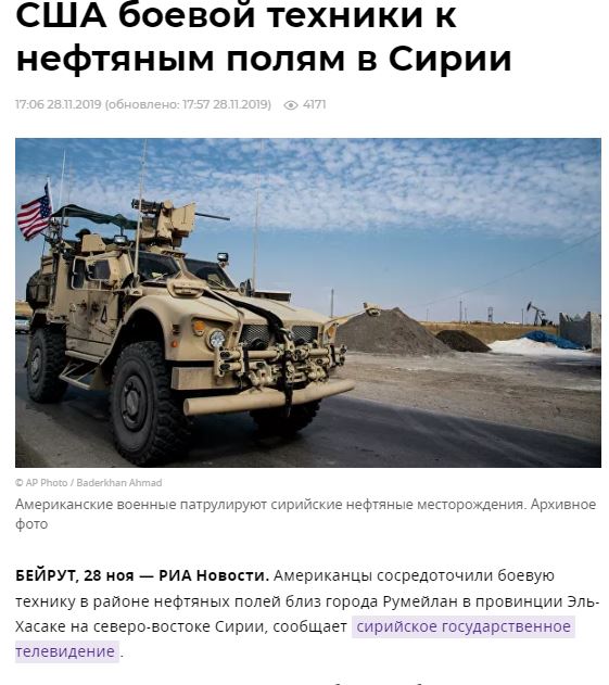 Όπως σημείωσε ο υπουργός Εξωτερικών Σεργκέι Λαβρόφ, οι Ηνωμένες Πολιτείες κατευθύνουν τα έσοδα από το πετρέλαιο στη στήριξη των πιστών ένοπλων ομάδων των Κούρδων.