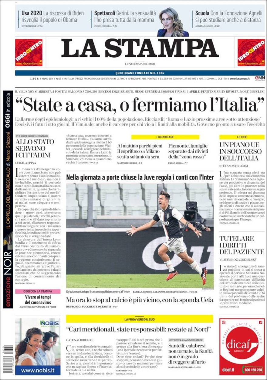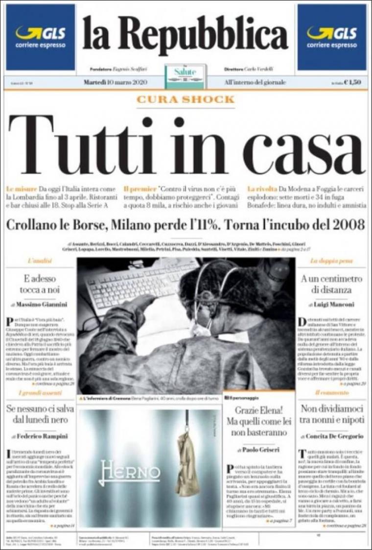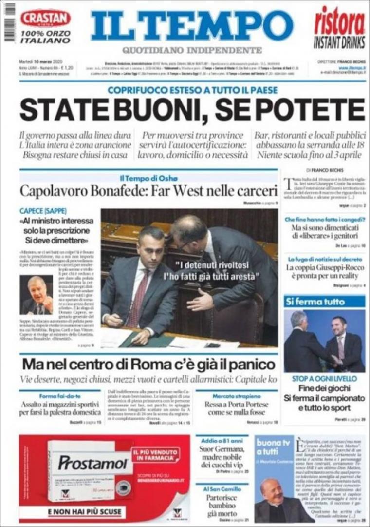 Οι εφημερίδες καλούν τον κόσμο να μείνει σπίτι. Μερικά χαρακτηριστικά πρωτοσέλιδα αναφέρουν: Il Tempo: «Καθίστε φρόνιμα, αν μπορείτε», La Republicca: «Ολοι στο σπίτι», La Stampa: «Καθίστε σπίτι, χειρόφρενο στην Ιταλία»!