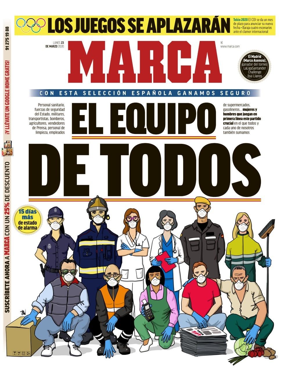 Ετσι λοιπόν, αντί στο πρωτοσέλιδό της να έχει κάποια νέα από τη Ρεάλ Μαδρίτης ή το ποδόσφαιρο γενικότερα (αν και δεν υπάρχουν πολλά αθλητικά νέα, είναι η αλήθεια), η Marca παρουσιάζει την ομάδα που μάχεται για όλους εμάς, υπό αντίξοες συνθήκες, την «ομάδα όλων μας».