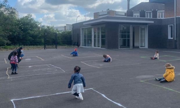 Όπως φαίνεται τα μικρά αγόρια και κορίτσια καλούνται να παίξουν σε «τομείς απομόνωσης» που έχουν σχηματιστεί με κιμωλία στην άσφαλτο για να δίνει την αίσθηση παιχνιδιού.