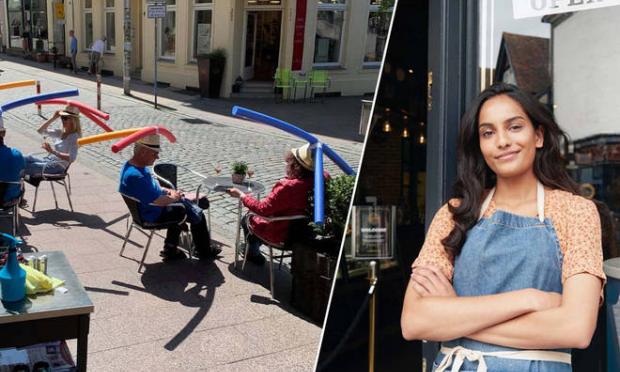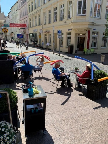 Συγκεκριμένα,προσφέρει αυτοσχέδια καπέλα στους πελάτες του, στα οποία έχουν τοποθετηθεί ειδικά σωσίβια για πισίνες, προκειμένου να διατηρηθεί η απόσταση ασφαλείας μεταξύ των θαμώνων.