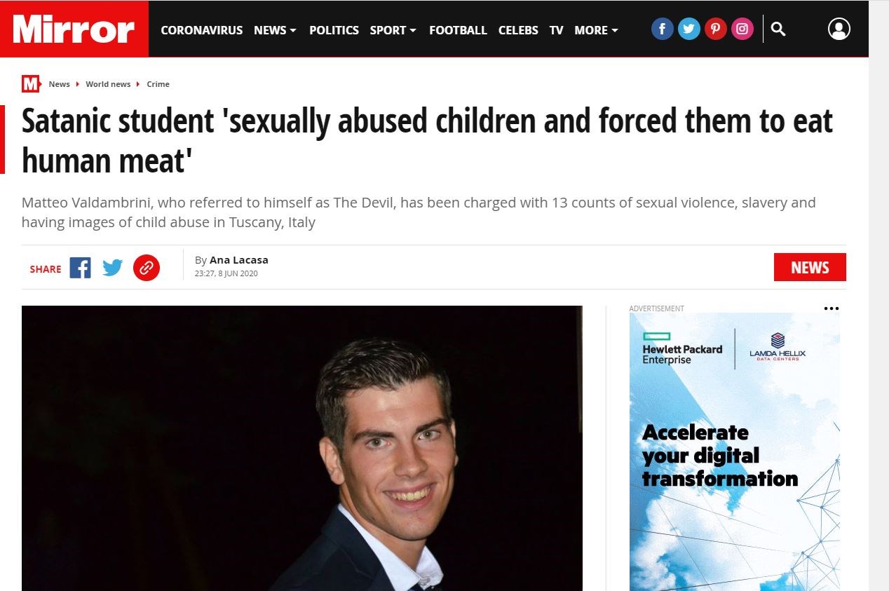Ο Matteo Valdambrini, ο οποίος αυτοαποκαλείται ως ‘Διάβολος’ συνελήφθη στην πόλη Πλάτο. Σύμφωνα με τη Mirror, o φοιτητής κατηγορείται ότι ηγήθηκε αίρεσης και πως έπειθε τα μέλη αυτής να επιδοθούν σε σεξουαλικές πράξεις μαζί του λέγοντας ότι με αυτό τον τρόπο θα αποκτήσουν υπερφυσικές δυνάμεις.
