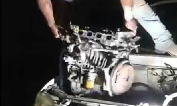 Όπως φαίνεται στο παρακάτω βίντεο, ο άντρας βγάζει τον κινητήρα και τον ακουμπά στον μπροστινό προφυλακτήρα, ώστε να πηδήξει στο έδαφος και να τον αφαιρέσει εντελώς από το όχημα.