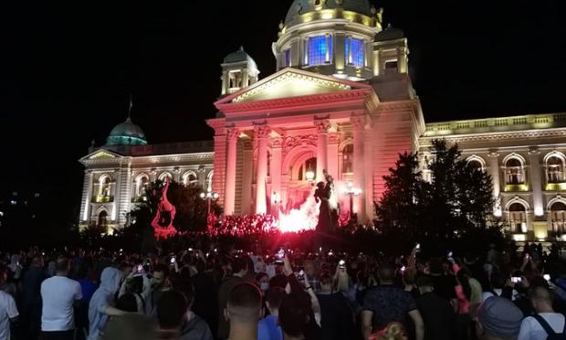 Η κατάσταση με το κορονοϊό ήταν πρόφαση για την συγκέντρωση που διοργανώθηκε - όπως είπε - «από ακροδεξιά στοιχεία και φασιστικές οργανώσεις». Ανέφερε ότι 43 αστυνομικοί τραυματιστήκαν και κάποιοι δέχθηκαν επίθεση με μαχαίρι, ενώ έδειξε και φωτογραφίες από τα τραύματα των αστυνομικών. Ο Βούτσιτς ανέφερε ότι έβλαψε το κύρος της Σερβίας στο εξωτερικό η χθεσινή διαδήλωση κάτι που όπως εκτίμησε θα βλάψει και τη διαπραγματευτική θέση της Σερβίας στον διάλογο για το Κόσοβο που θα συνεχιστεί την Κυριακή στις Βρυξέλλες. Διεμήνυσε ότι οι αρχές θα πατάξουν κάθε προσπάθεια κατάλυσης της τάξης και τόνισε ότι υπήρχε και εξωτερικός δάκτυλος για τα επεισόδια που προκλήθηκαν εχθές βράδυ.