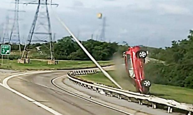 Στην συνέχεια, το προπορευόμενο όχημα άρχισε κάποιους επικίνδυνους ελιγμούς, χτύπησε στις μπαριέρες που ήταν δίπλα του, άλλαξε πορεία και καρφώθηκε με δύναμη στις μπαριέρες που ήταν στην άλλη πλευρά του δρόμου. Μάλιστα, από την ταχύτητα που είχε, το κόκκινο αυτοκίνητο βρέθηκε στον αέρα και χτύπησε μία κολώνα, την οποία και διέλυσε.