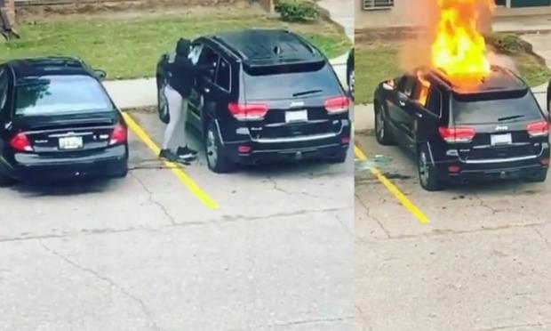 Μια κυρία με καλυμμένο το πρόσωπό της, σπάει το πίσω τζάμι ενός μαύρου Jeep και περιχύνει με βενζίνη το εσωτερικό του αυτοκινήτου, το οποίο πιθανότατα άνηκε στον πρώην σύντροφό της.