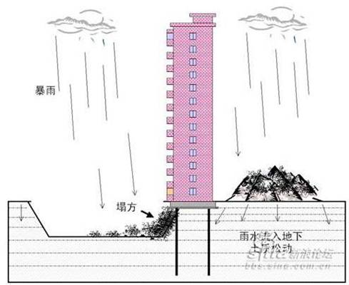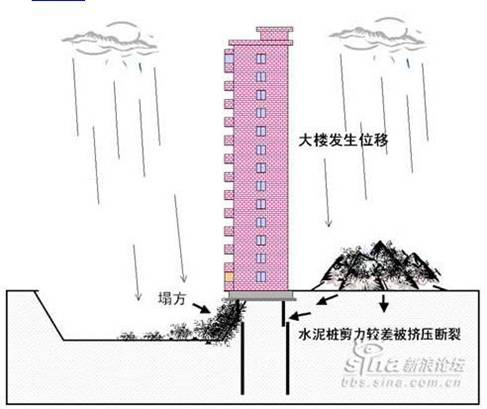 Για τη δημιουργία ενός υπόγειου γκαράζ, οι εργάτες έσκαψαν σε βάθος πέντε μέτρων κάτω από τη μία πλευρά του κτηρίου. Το χώμα που έβγαλαν από εκεί συγκεντρώθηκε στην άλλη πλευρά, σε ένα σωρό ύψους 10 μέτρων. Αυτό οδήγησε στην άνιση κατανομή του βάρους του κτηρίου, το οποίο άρχισε να γέρνει. Τα θεμέλια στη μία πλευρά φυσικά δεν άντεξαν το επιπλέον βάρος και έσπασαν.