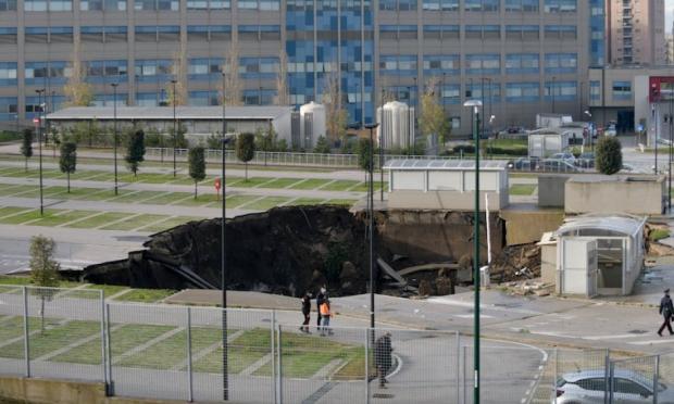 Μια τεράστια οπή δημιουργήθηκε νωρίς σήμερα το πρωί στο πάρκινγκ του νοσοκομείου Del Mare, στην πόλη της Νάπολης στην Ιταλία. Το έδαφος υποχώρησε και δημιουργήθηκε τρύπα βάθους περίπου 20 μέτρα. Μέσα στην τεράστια αυτή οπή έχουν πέσει αυτοκίνητα, αλλά, όπως μεταδίδουν τα ιταλικά μέσα ενημέρωσης, μέχρι αυτή την στιγμή δεν προκύπτει να υπάρχουν τραυματίες.