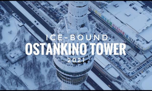 Όπως παρουσιάζει το βίντεο από drone, ο ύψος 540 μέτρων Πύργος Οστάνκινο στέκει αγέρωχος καλυμμένος με πάγο, πάνω από τη ρωσική μεγαλούπολη.