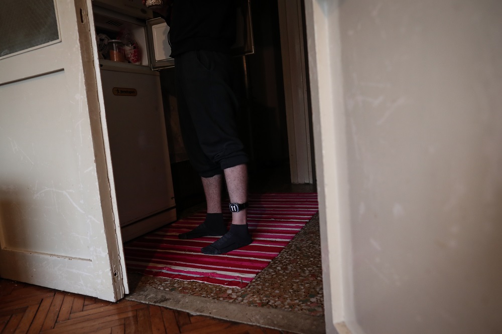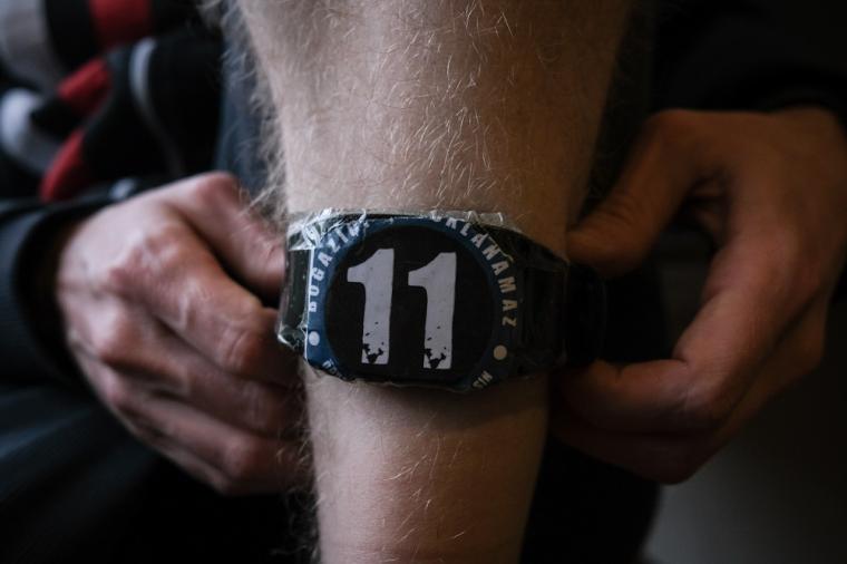 Ο Goksu Uyar, δείχνει το ηλεκτρονικό βραχιόλι παρακολούθησης στο πόδι του. Συνελήφθη στις 29 Ιανουαρίου στην Κωνσταντινούπολη