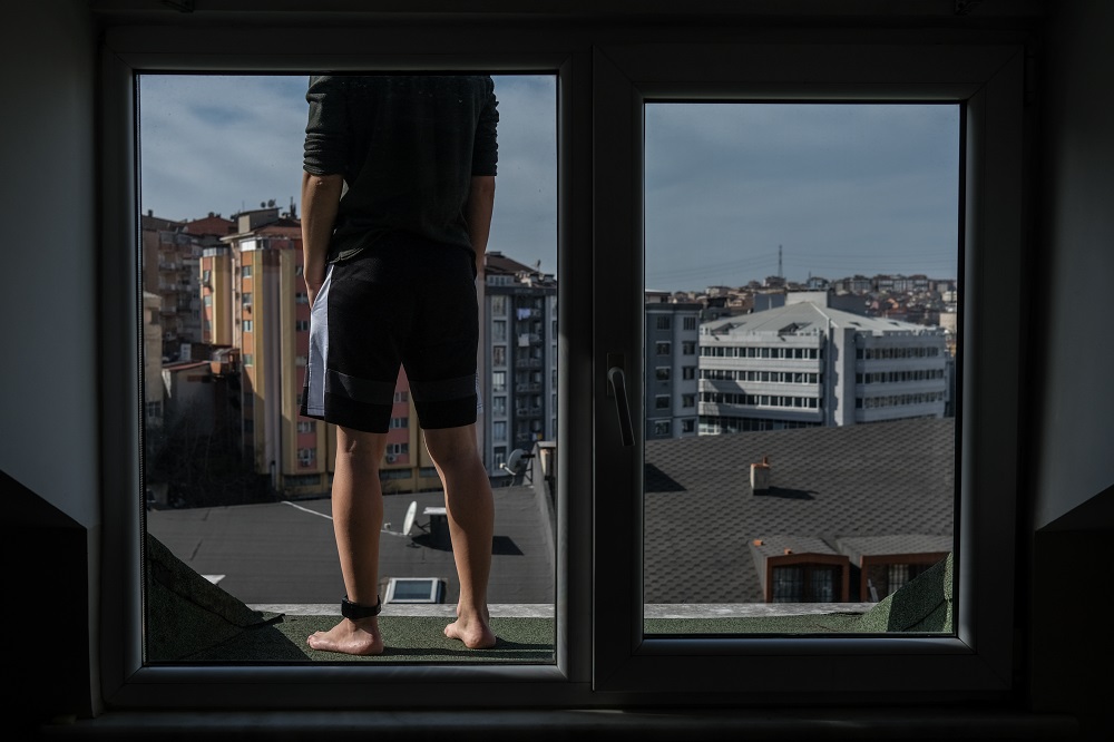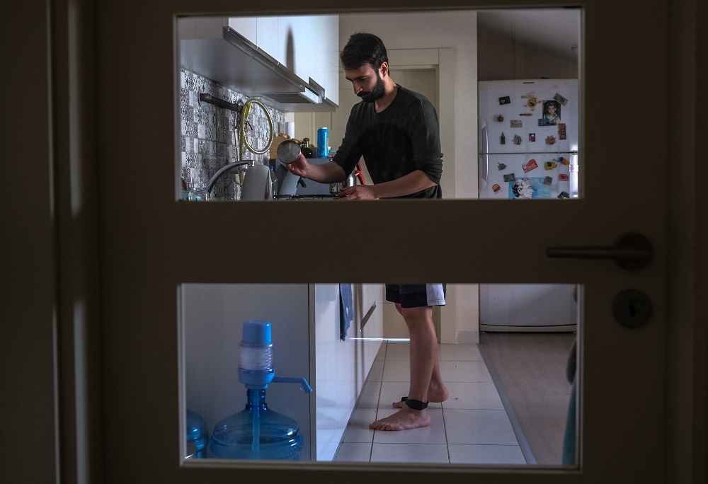 Ο Baran Dogan, στο μπαλκόνι του, στην Κωνσταντινούπολη, σε κατ’ οίκον περιορισμό με βραχιολάκι
