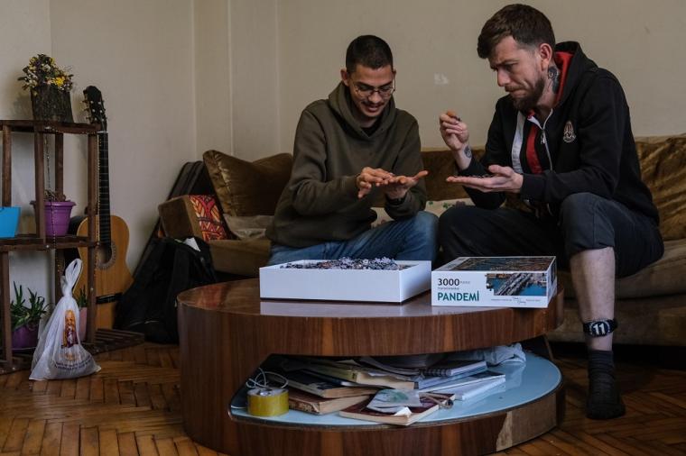 O σερβιτόρος Goksu Uyar (Δ) φτιάχνει παζλ με τον συγκάτοικό του κατά την διάρκεια του κατ’ οίκον περιορισμού του.