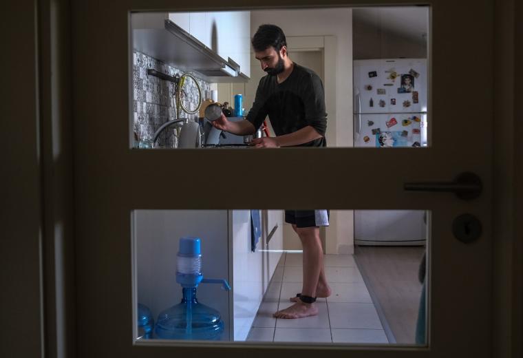 Ο Bartender Goksu Uyar ετοιμάζει το φαγητό του στην κουζίνα του διαμερίσματος.