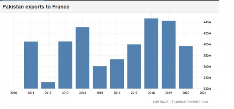 Το διμερές εμπόριο του Πακιστάν με τη Γαλλία σημείωσε άνθηση τα τελευταία χρόνια. Οι τετεμένες σχέσεις με τους Γάλλους όχι μόνο θα οδηγήσουν το Πακιστάν σε κίνδυνο 1,1 δισεκατομμυρίων δολαρίων, που κερδίζει μέσω των εξαγωγών του στη Γαλλία, αλλά μπορεί να επηρεάσει το εμπόριό του και με άλλες χώρες της Ευρωπαϊκής Ένωσης (ΕΕ). Οι εξαγωγές του Πακιστάν στην ΕΕ σημείωσαν αύξηση 65%, από 4,538 δισεκατομμύρια ευρώ το 2013 σε 7,492 δισεκατομμύρια ευρώ το 2019.