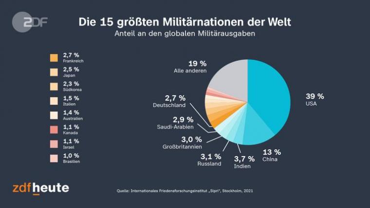Ο λόγος: Σύμφωνα με το Sipri, οι χώρες αυτού του κόσμου ξόδεψαν συνολικά περίπου 1.981 δισεκατομμύρια αμερικανικά δολάρια για τον στρατό τους το 2020 - σχεδόν δύο τρισεκατομμύρια δολάρια για τους μισθούς των μελών των ενόπλων δυνάμεων, των οπλοστασίων και αποστολών μάχης.