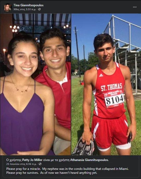 Μεγάλη αγωνία επικρατεί για την τύχη του 21χρονου Έλληνα που αγνοείται μετά την κατάρρευση της 12όρωφης πολυκατοικίας στο Μαϊάμι στις 24 Ιουνίου.