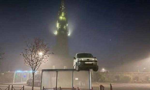 Στις 11 Οκτώβρη, ένα άσπρο Renault Kangoo βρέθηκε να ισορροπεί πάνω στη στέγη στάσης λεωφορείου, με την ασυνήθιστη εικόνα να μην αργεί να γίνει viral στα social media.
