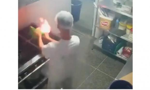 Το περιστατικό, που καταγράφηκε από κλειστό κύκλωμα, συνέβη σε εστιατόριο στην Τουρκία, όταν ο μάγειρας θεώρησε πως με λίγο νερό θα μπορούσε να σβήσει φωτιά που έχει αρπάξει σε καμμένο λάδι.