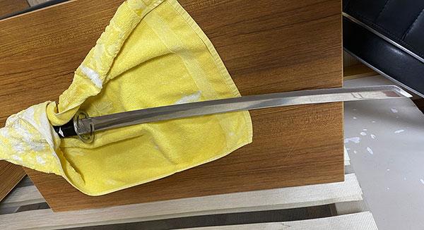 Στον χώρο βρέθηκαν επίσης και κατασχέθηκαν 15 ξίφη και μαχαίρια, ανάμεσά τους και το σπαθί σαμουράι που χρησιμοποιήθηκε στη δολοφονική επίθεση.