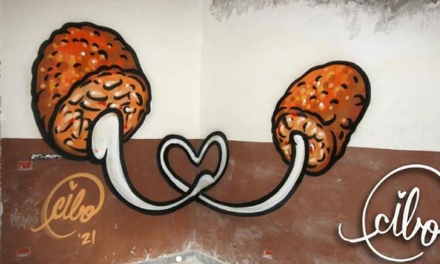 «Φροντίζω την πόλη μου αντικαθιστώντας σύμβολα μίσους με λαχταριστά εδέσματα», λέει ο 39χρονος καλλιτέχνης, το πραγματικό όνομα του οποίου είναι Πιερπάολο Σπινάτσε και το καλλιτεχνικό του Cibo (η ιταλική λέξη για το φαγητό).