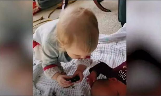 Αυτή η μπέμπα δεν ήταν καθόλου ευχαριστημένη με τον μικρό ξάδερφό της που έκλαιγε τόσο δυνατά. Γι’ αυτό πήρε το τηλεκοντρόλ της τηλεόρασης και προσπάθησε να του χαμηλώσει την ένταση στο κλάμα.