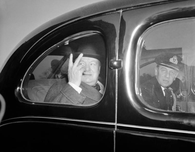1941, ΗΠΑ. Ο Ουίνστον Τσόρτσιλ, ο οποίος βρίσκεται σε επίσημη επίσκεψη στην Ουάσινγκτον, κάνει το χαρακτηριστικό σήμα της νίκης αποχωρώντας από το Καπιτώλιο.
