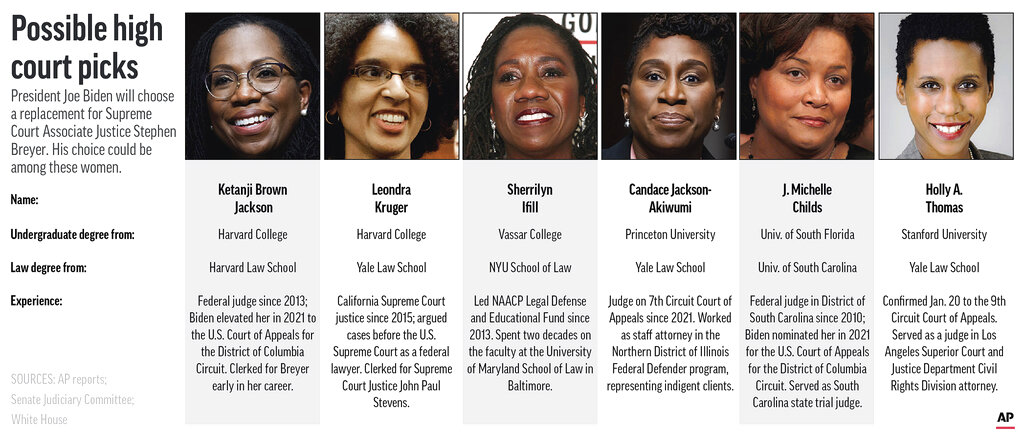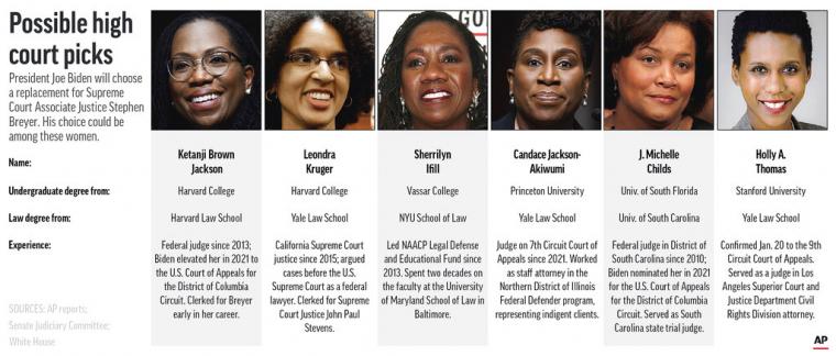 Επικρατέστερες υποψήφιες για τη θέση στο Ανώτατο Δικαστήριο θεωρούνται η 51χρονη Κετάντζι Μπράουν Τζάκσον, που έχει διοριστεί από τον πρόεδρο των ΗΠΑ στο Ομοσπονδιακό Εφετείο της Ουάσιγκτον, η 45χρονη Λιόντρα Κρούγκερ, δικαστής στο Ανώτατο Δικαστήριο της Καλιφόρνιας και η Τζουλιάνα Μισέλ Τσάιλντς, 55 ετών, δικαστής στο Ομοσπονδιακό Δικαστήριο στη Νότια Καρολίνα από το 2010.