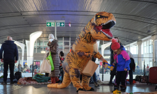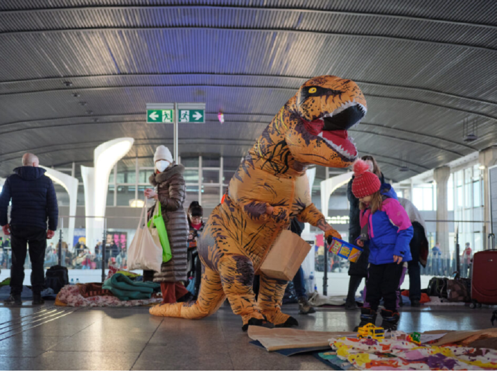 Αλλά ίσως κανένας δεν το έκανε πιο εντυπωσιακά από έναν άντρα που φοράει μια στολή δεινοσαύρου κάθε μέρα για να διασκεδάσει τα παιδιά πρόσφυγες στη Βαρσοβία, σύμφωνα με το ertnews.gr.