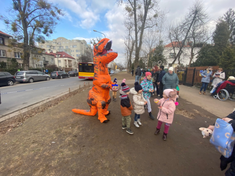 Ο Tomasz Grzywiński είχε την ιδέα να ντυθεί δεινόσαυρος και να μοιράσει λιχουδιές στα παιδιά στον κεντρικό σιδηροδρομικό σταθμό της Βαρσοβίας – όπου πολλοί πρόσφυγες κοιμούνται στο πάτωμα – αφού αρχικά πήρε σάντουιτς για να ταΐσει τους νεοαφιχθέντες, αναφέρει η Wirtualna Polska.