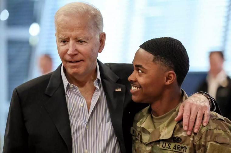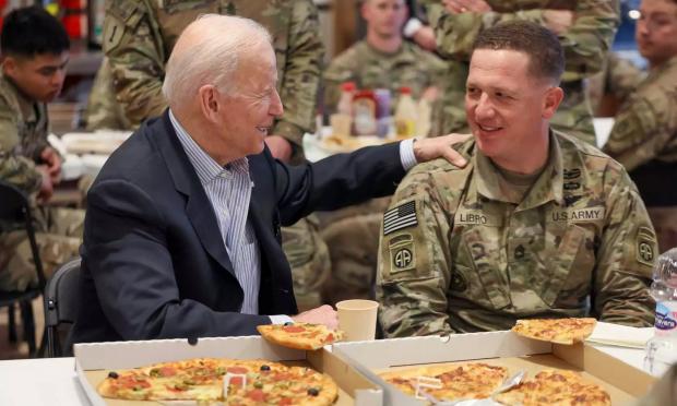 Στη συνέχεια, ο Μπάιντεν, με κοστούμι και ριγέ πουκάμισο αλλά χωρίς γραβάτα, κάθισε ανάμεσα σε στρατιώτες σε μια τραπεζαρία, για να φάει μια φέτα πίτσα.
